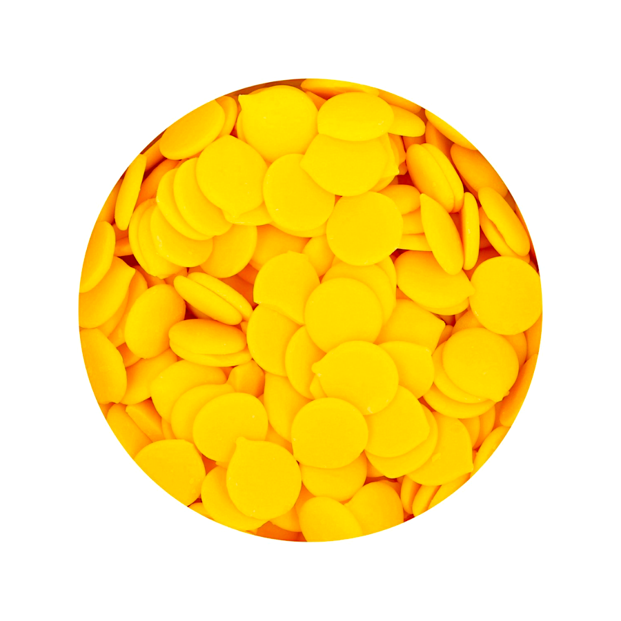 Estes Deco Melts "amarelos" têm um delicioso sabor de chocolate branco cremoso. Pode colori-los facilmente com corantes alimentares amigos do chocolate.